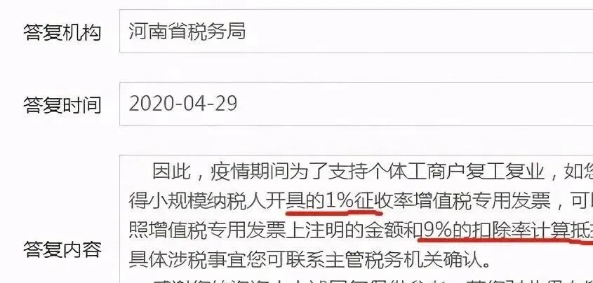增值税又变了!1%的专票可以抵9%的进项!附:最新最全税率表一、税务局明确!1%的专票可以抵9%的进项! 根据规定,自2020年3月1日至12月31日,除湖北省外的小规模纳税人,可以开具1%的专票。此外,对于一般纳税人购进农产品,取得小规模纳税人(简易计税;适用3%征收率)开具的专用发票,以增值税专用发票上注明的金额和9%的扣除率计算进项税额。 根据官方给的明确答复!1%的专票是可以抵扣9%进项税的。5