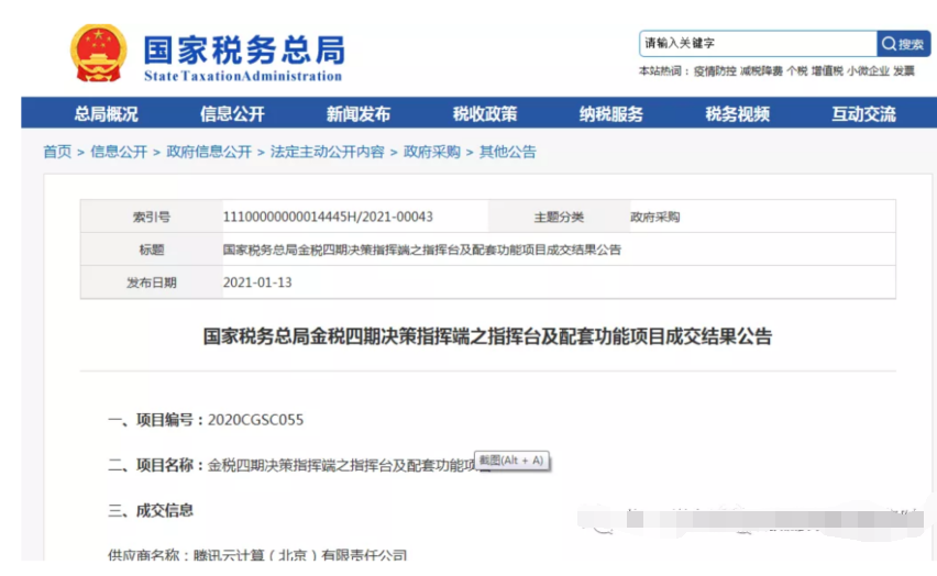 最近,国家税务总局发布金税四期决策指挥端之指挥台及配套功能项目成交结果公告: